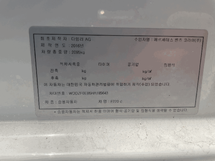 | 차대번호 | WDDZF0EB5HA185643 | ||