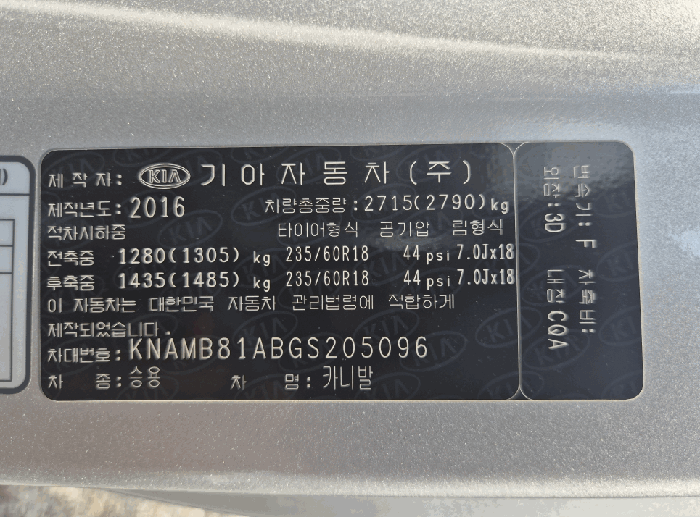 | 차대번호 | KNAMB81ABGS205096 | ||