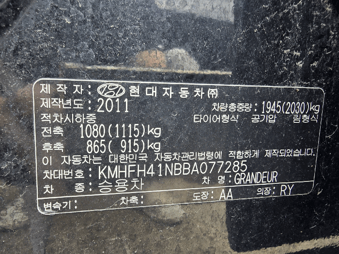 | 차대번호 | KMHFH41NBBA077285 | ||