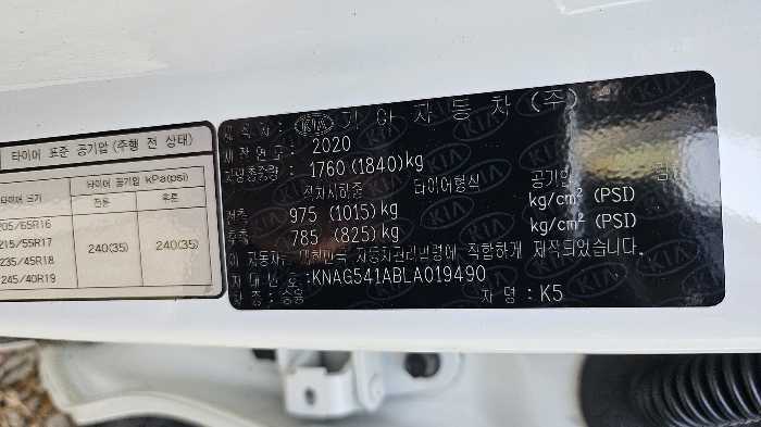 | 차대번호 | KNAG541ABLA019490 | ||