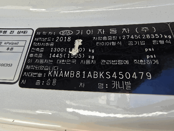 | 차대번호 | KNAMB81ABKS450479 | ||