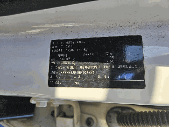 | 차대번호 | KPBXH3AP1GP102784 | ||