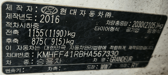 | 제조사 | 현대 | 차량명 | 그랜저(GRANDEUR) |
