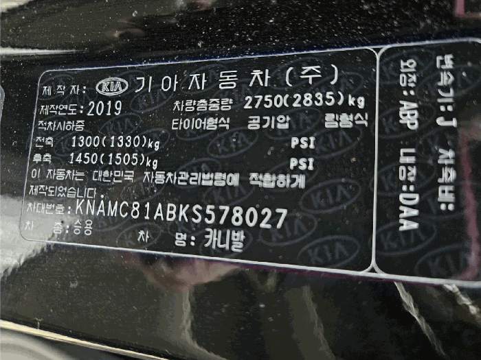 | 차대번호 | KNAMC81ABKS578027 | ||