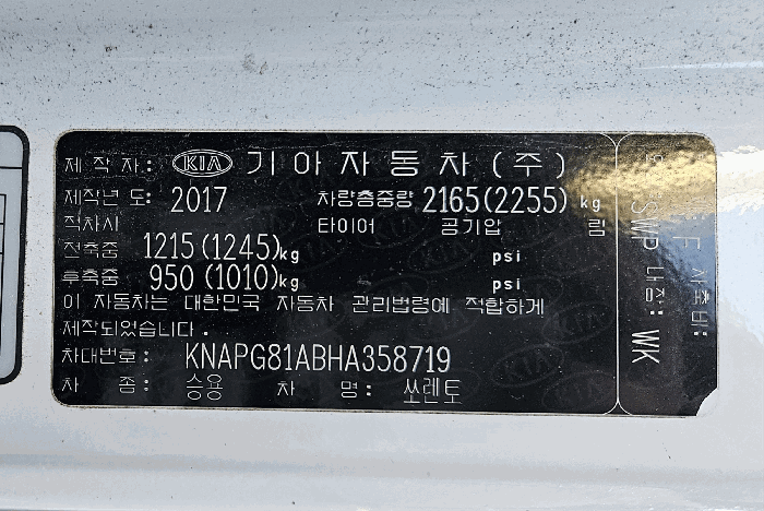 | 차대번호 | KNAPG81ABHA358719 | ||