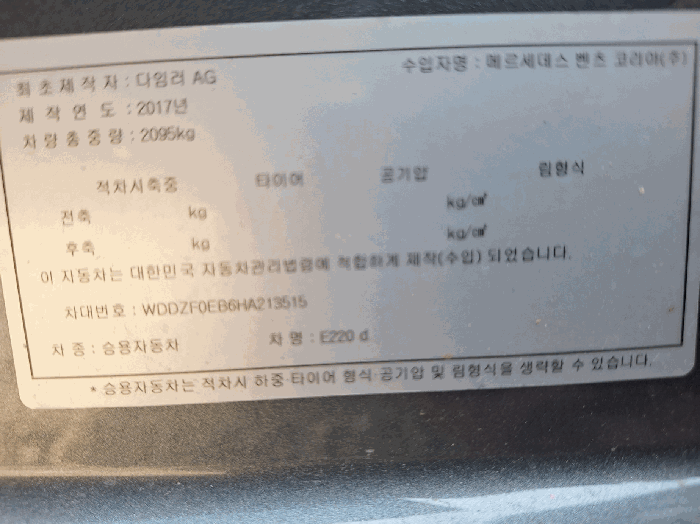 | 차대번호 | WDDZF0EB6HA213515 | ||