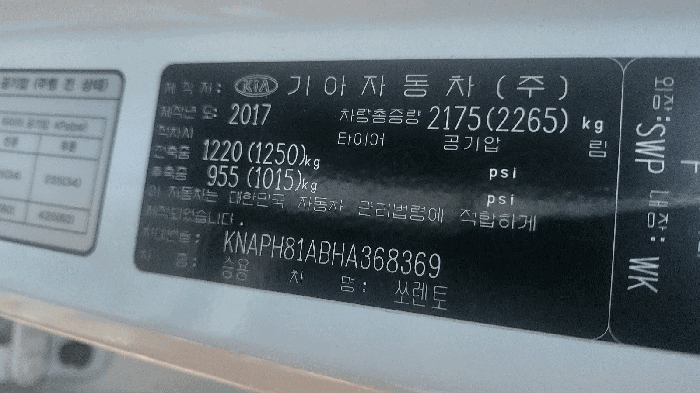 | 차대번호 | KNAPH81ABHA368369 | ||