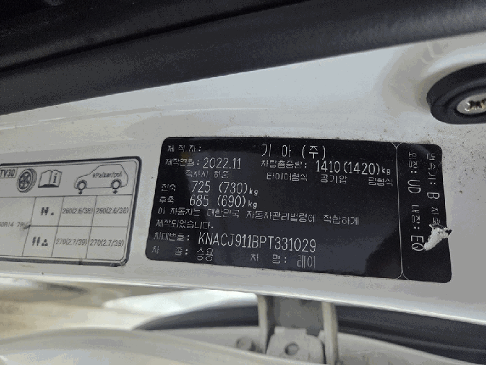 | 차대번호 | KNACJ911BPT331029 | ||