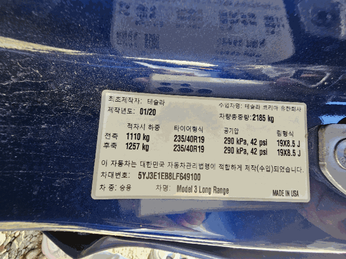 | 차대번호 | 5YJ3E1EB8LF649100 | ||